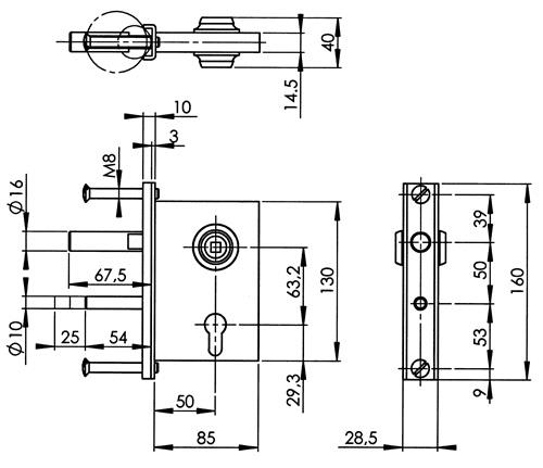 mittelschwer · mit U-Stulp · verzinkt · rechts und links verwendbar · Falle aus Zinkdruckguss, Riegel aus Stahl · vorgerichtet für Profilzylinder · Dornmaß 50 mm · Nuss 8 mm· 2-tourig · Kastenbreite 85 mm · BB mit Nachrüstsatz mit Wechsel